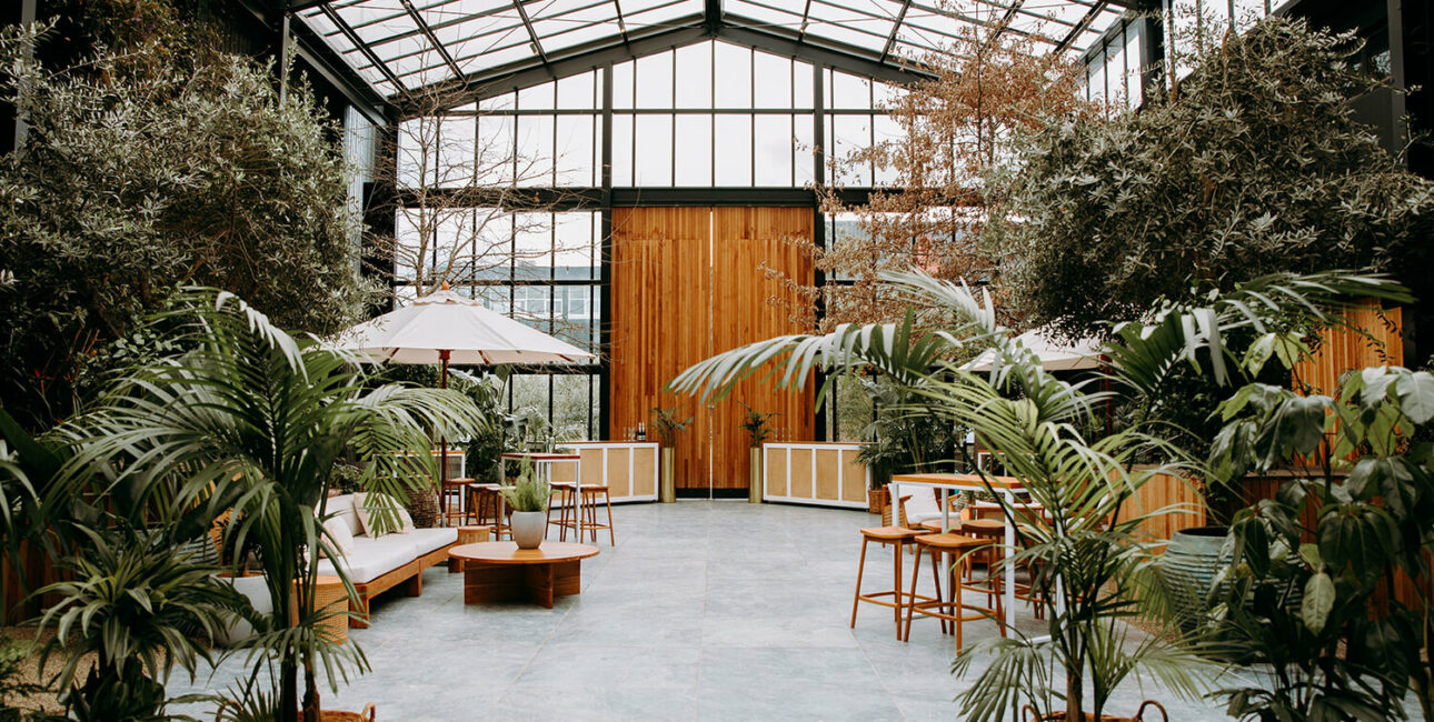 Usually, a room flip takes about 1.5 hours (with the venue completely empty of guests) but more time may be required if you have more complex table arrangements and/or larger guest numbers. We recommend having a greenery partition or drape when you remain in Glasshouse for a room flip – see below for a layout example.